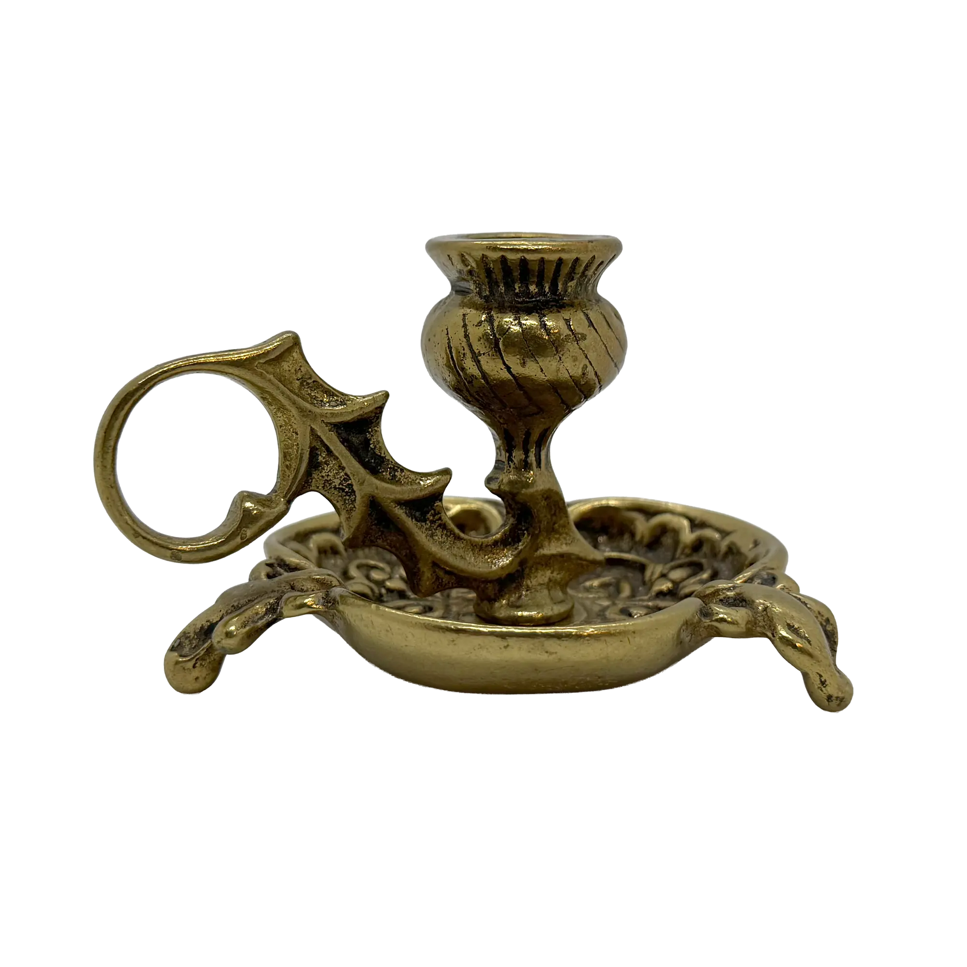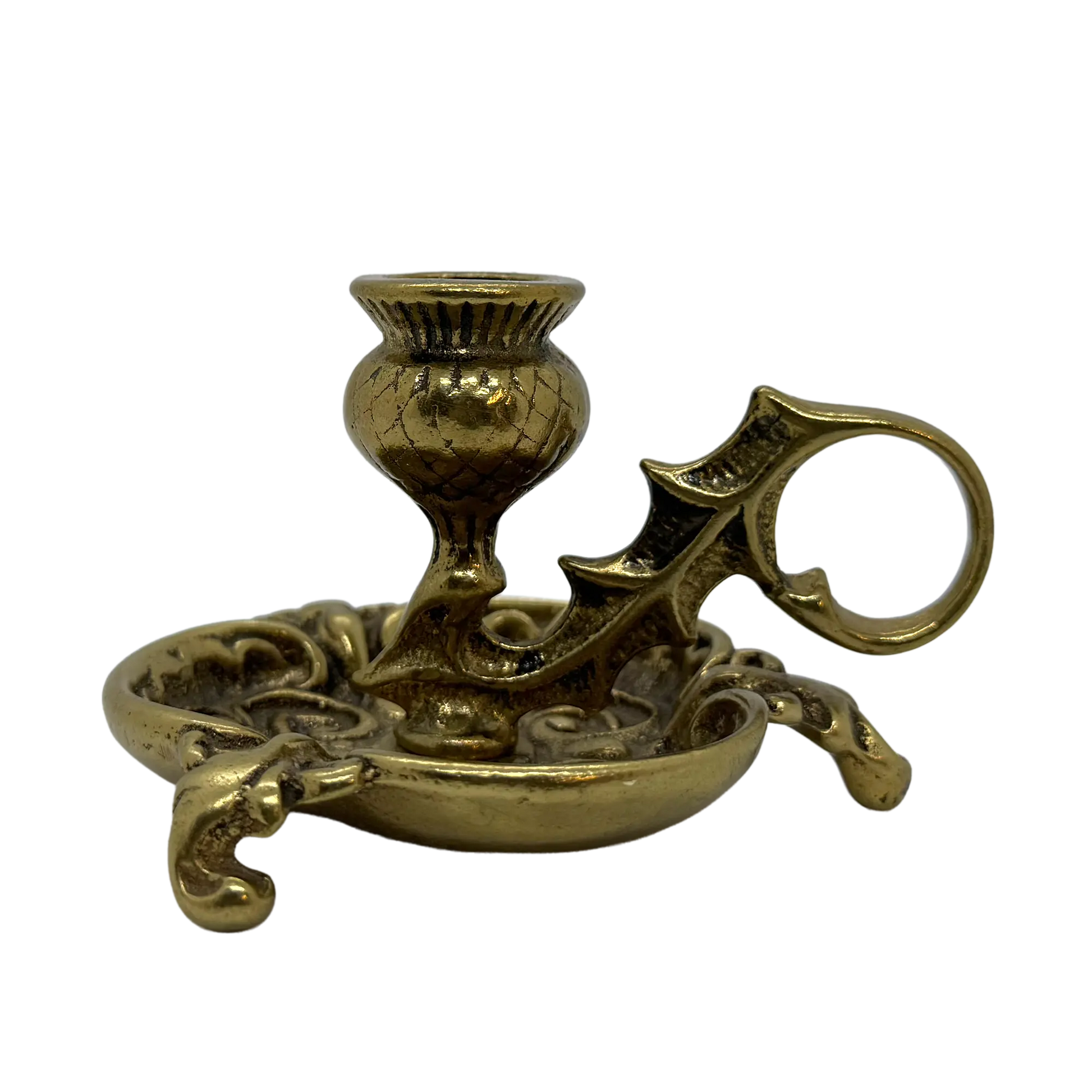 This piece is hard to date but is likely antique (circa 1850's). The Scottish thistle brass chamberstick features an intricate design of leaves and a flower and holds a standard taper candle. The history of Scottish brass thistle candle holders is deeply rooted in the cultural and artistic heritage of Scotland and have been a part of their homes for centuries.