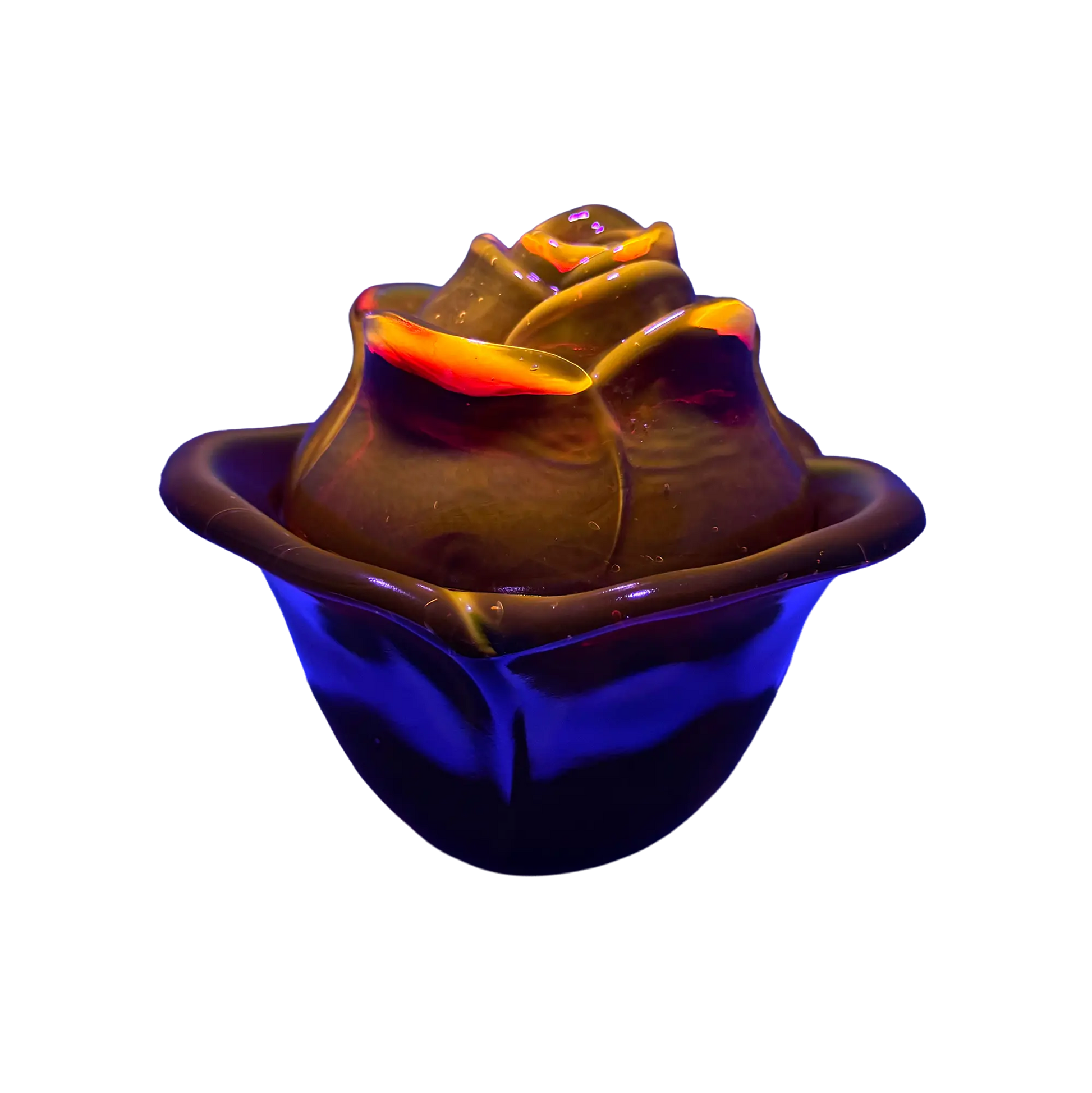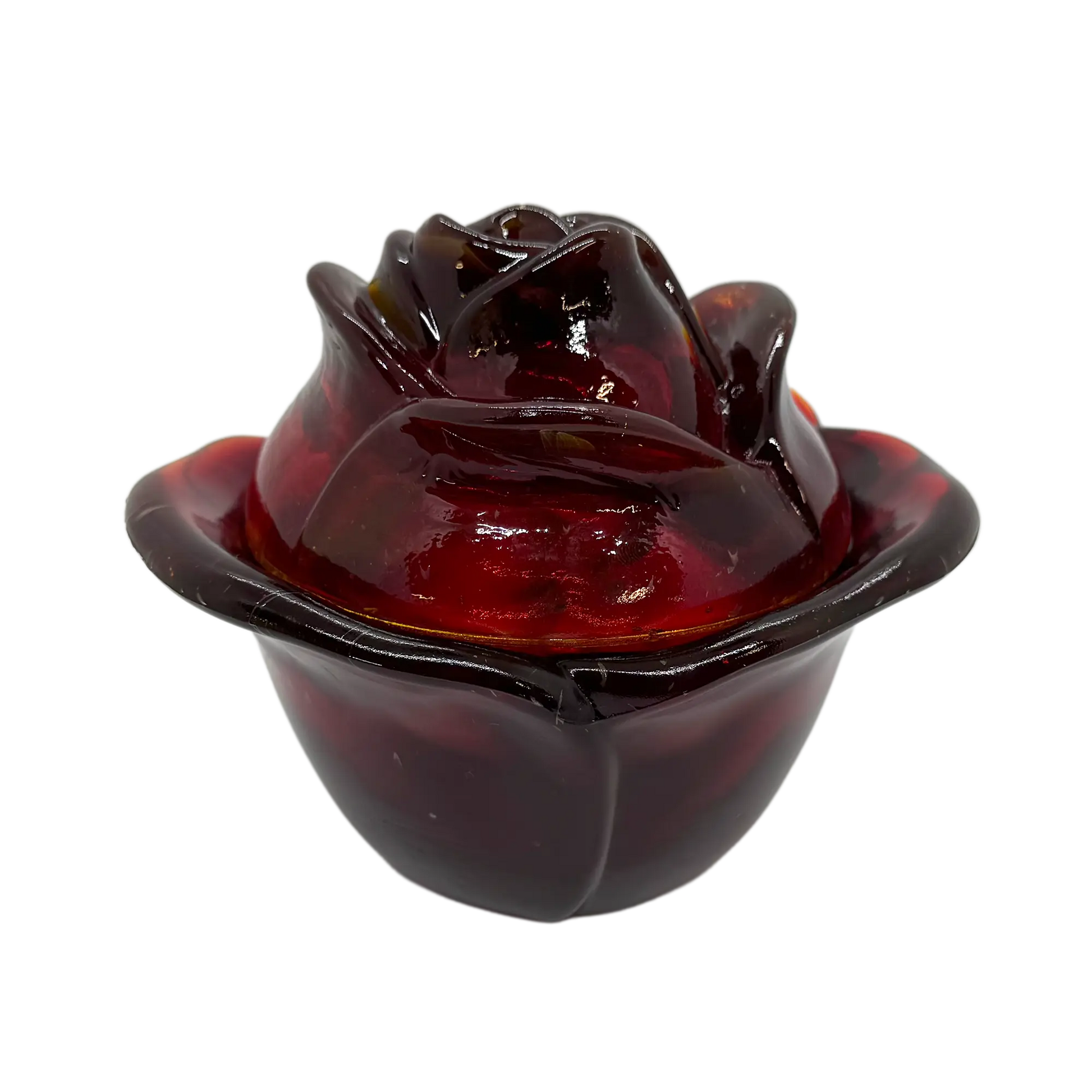 This lidded candy dish was produced by L.E. Smith in a rich amberina color with a rose pattern. Founded in 1907, the L.E. Smith Glass Company had a rich history in glass manufacturing and made significant contributions to the glass industry before closing in 2005.