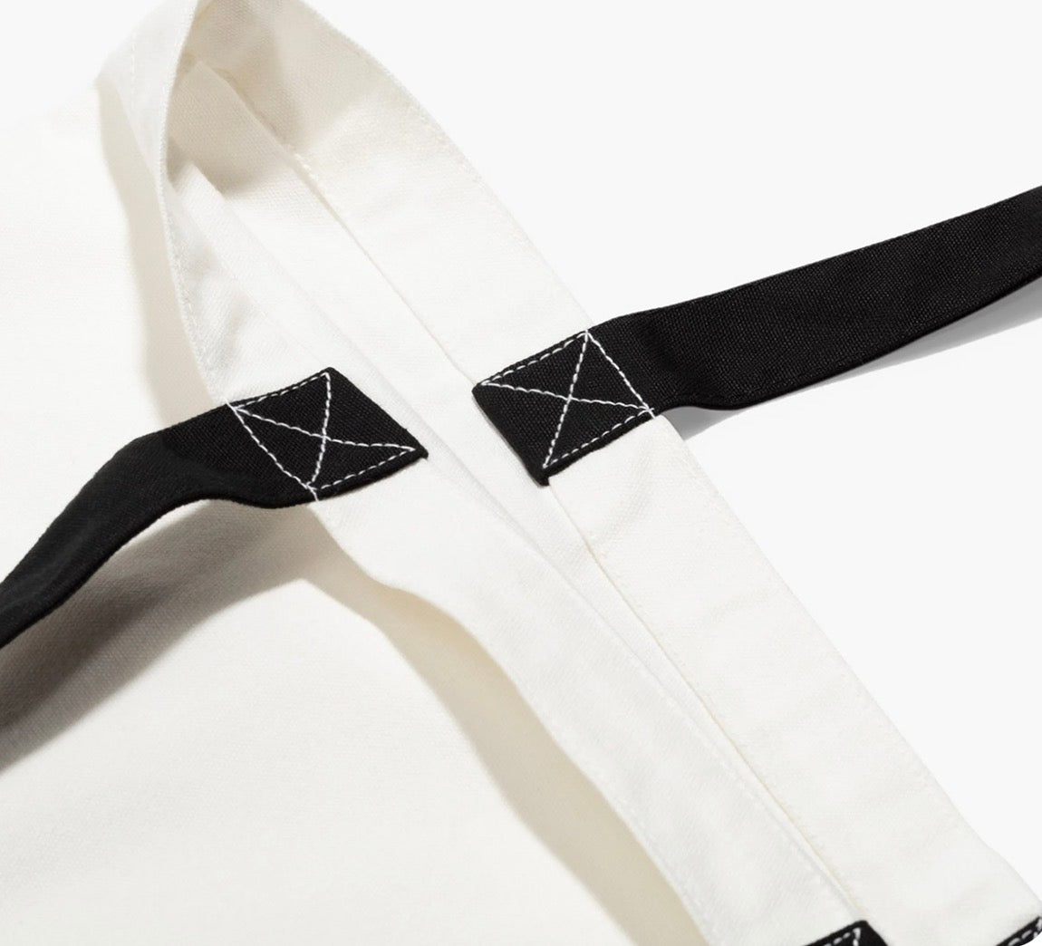 With orange blossom graphics and shop logo on a white canvas with black trim and handles.