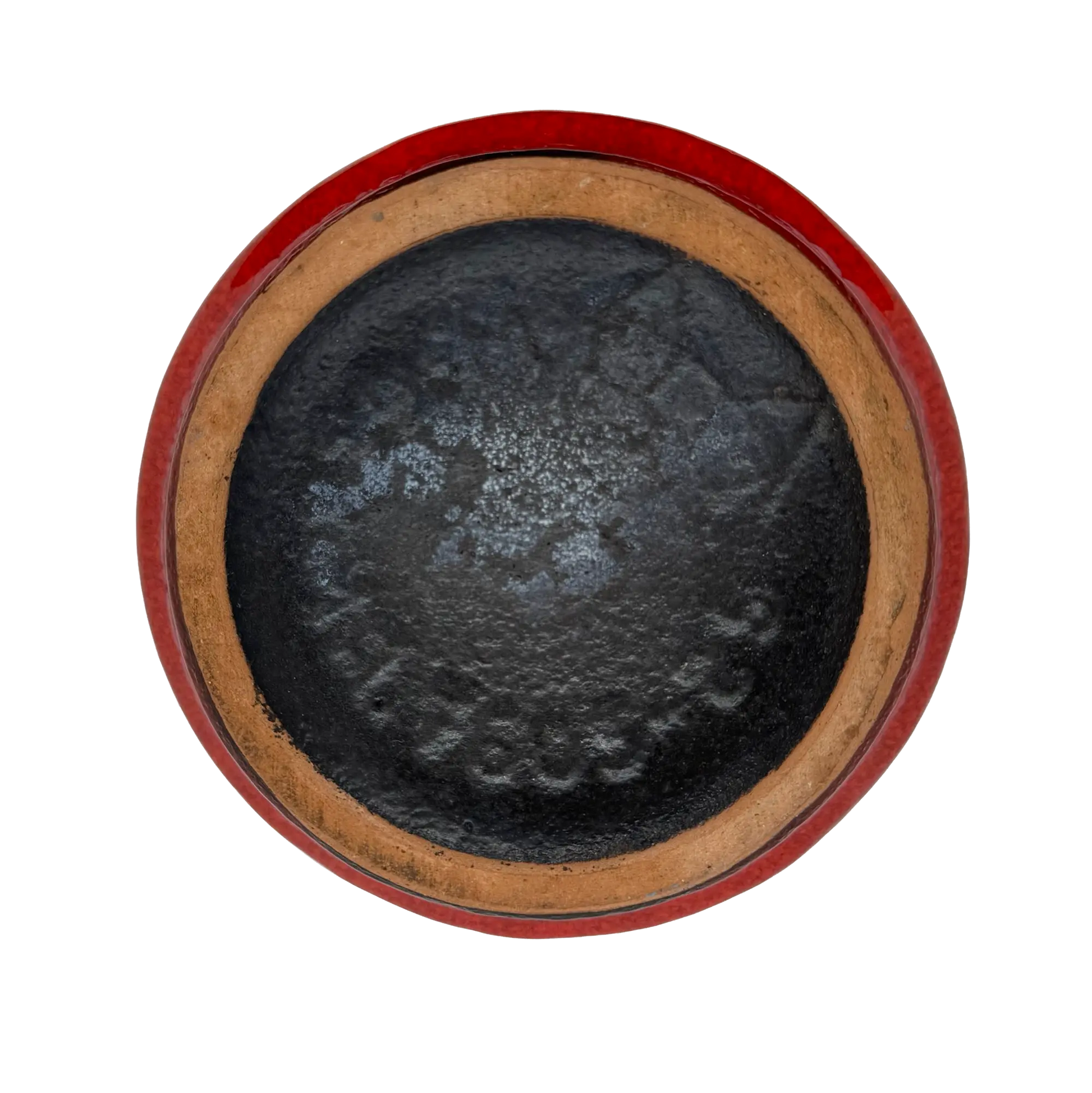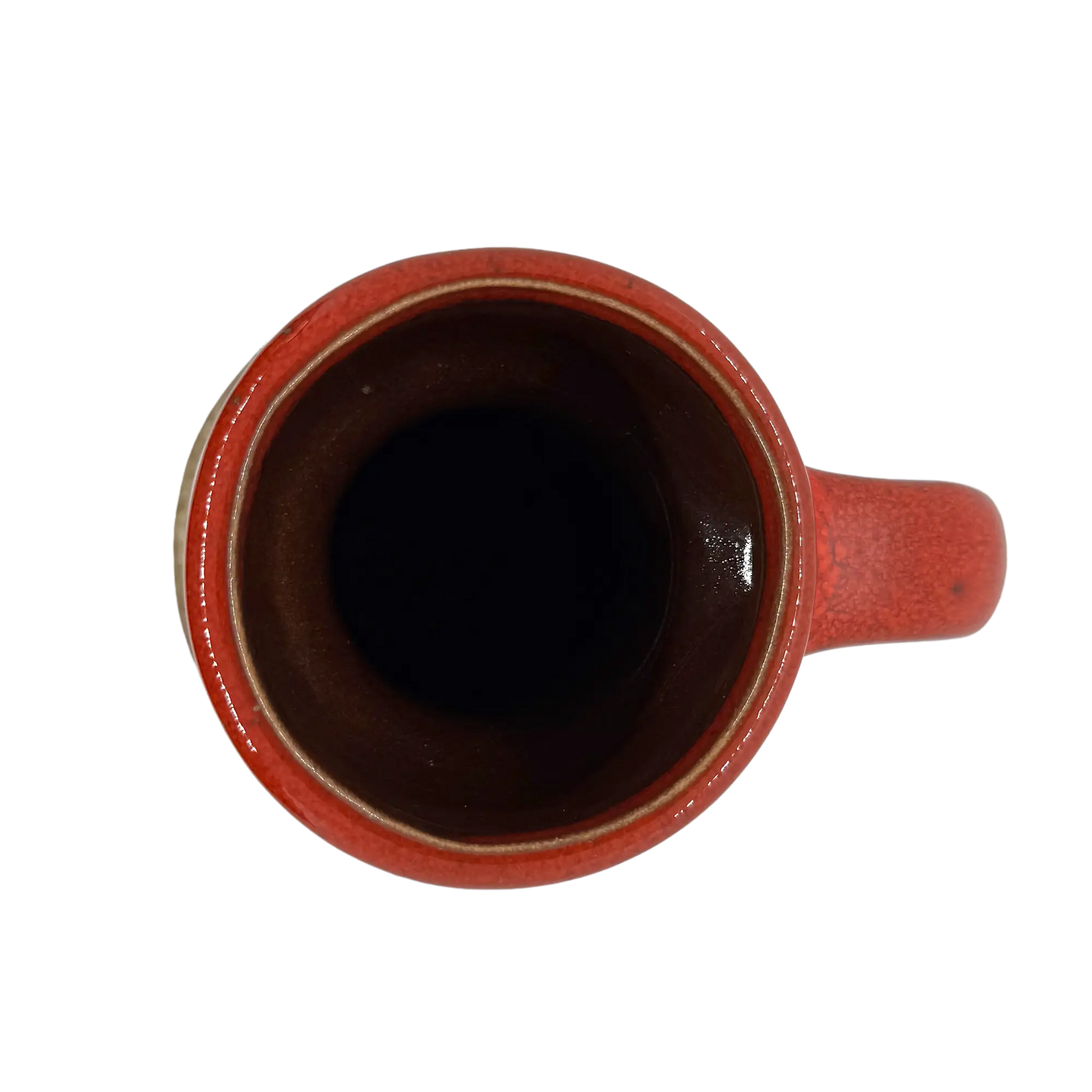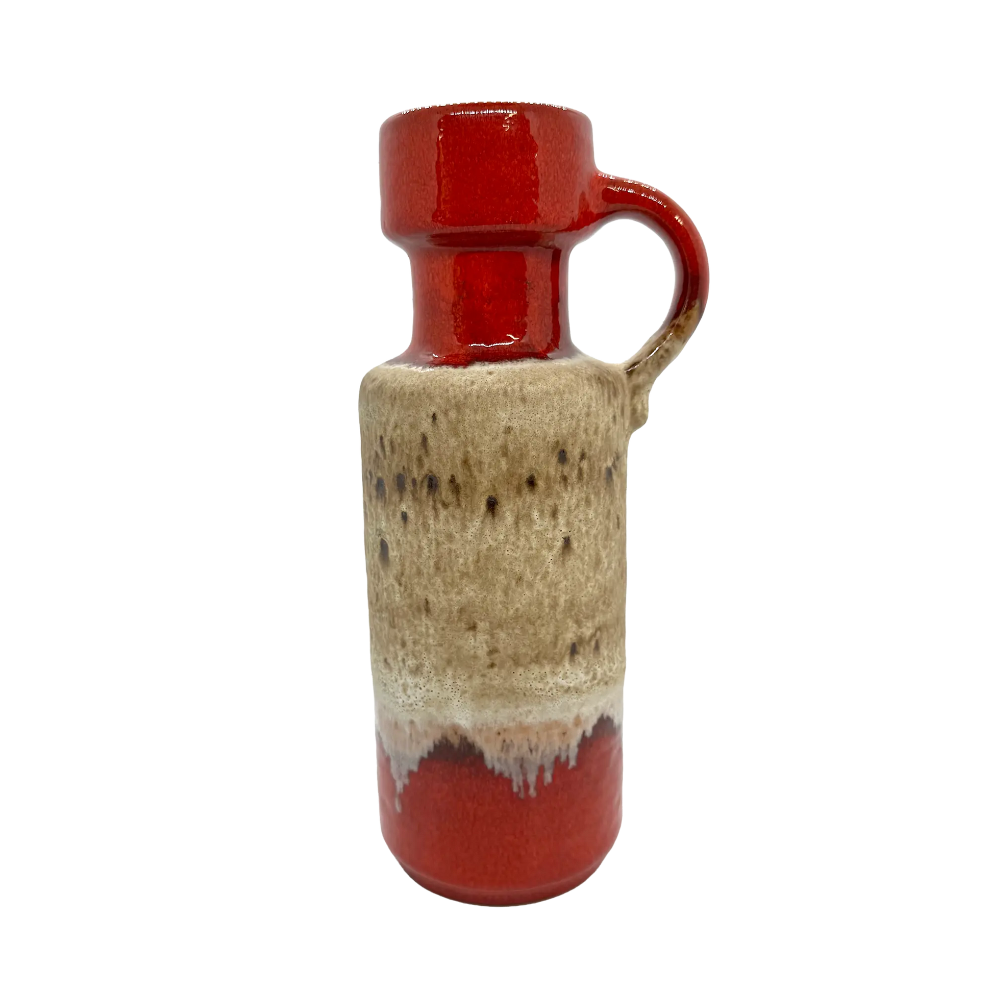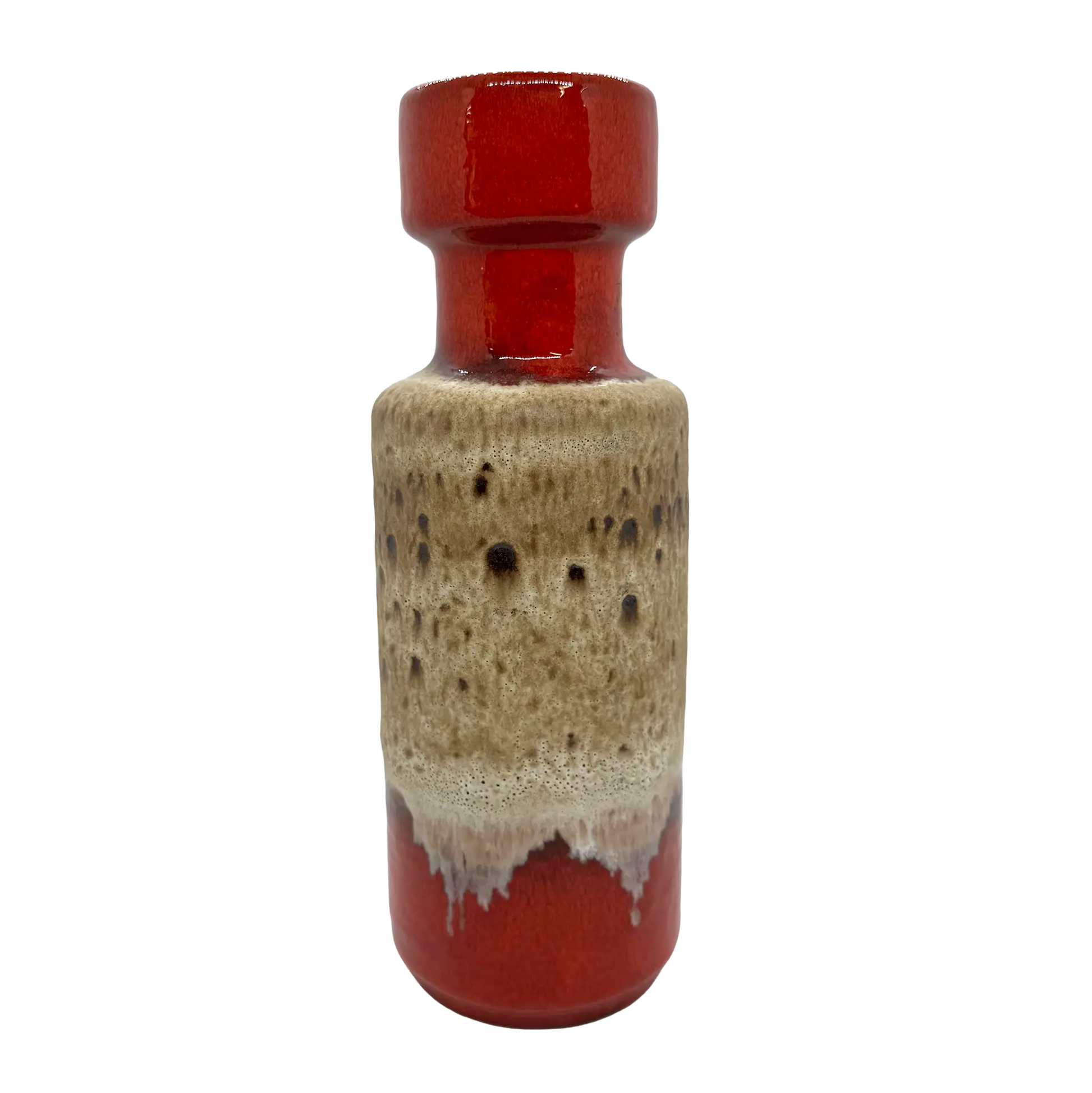 This pottery vase by Scheurich has a striking red-orange tone with an earthy cream and brown glaze dripping down the center. It is in excellent vintage condition with no chips or cracks. Numbered and marked W. Germany on the base.